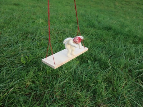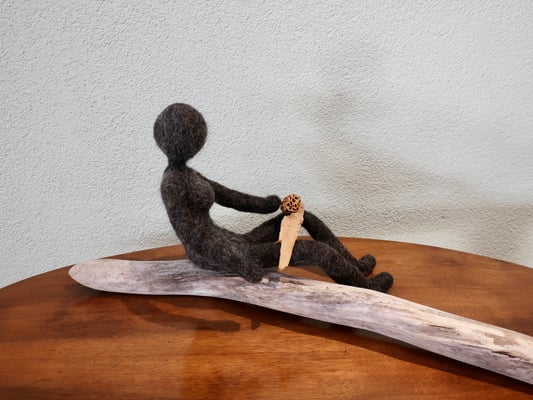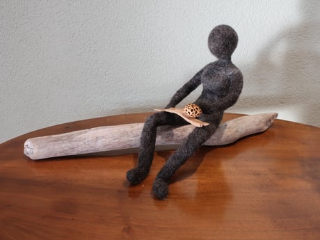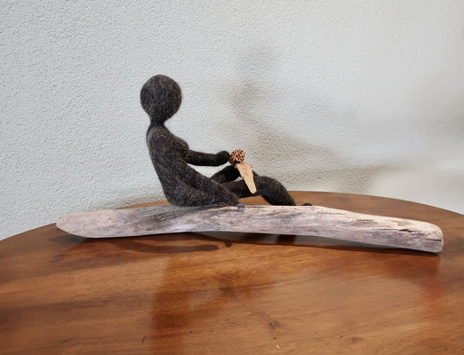 Figur aus der Wolle vom schwarzen Walliser Schwarznasenschaf (Spitti), Fundholz, Samenkapsel