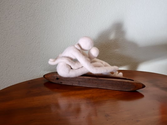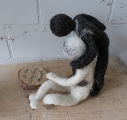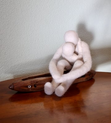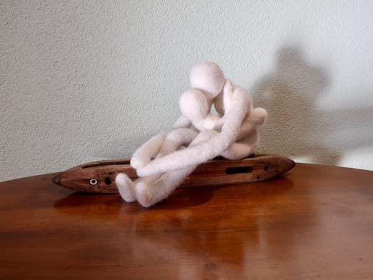Figurengruppe aus der Wolle vom Walliser Schwarznasenschaf (vom schwarzen Spitti wie vom weissen Schaf) und Holz