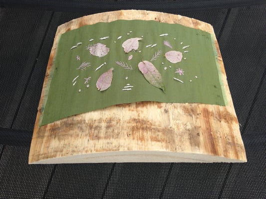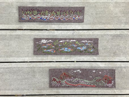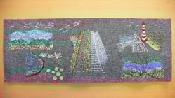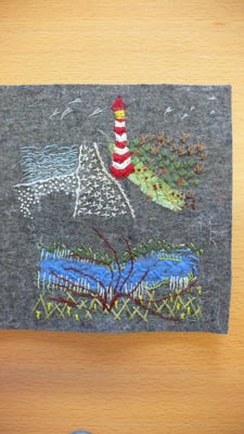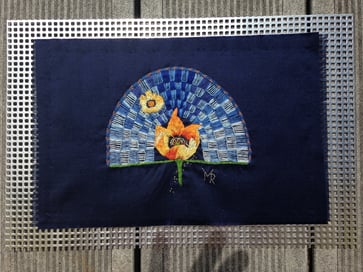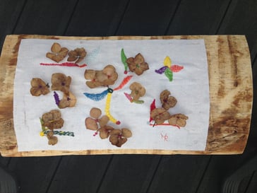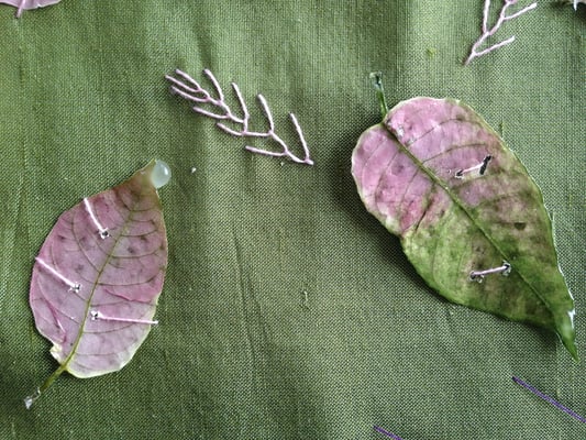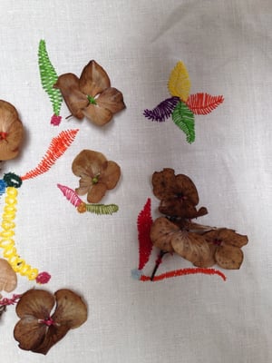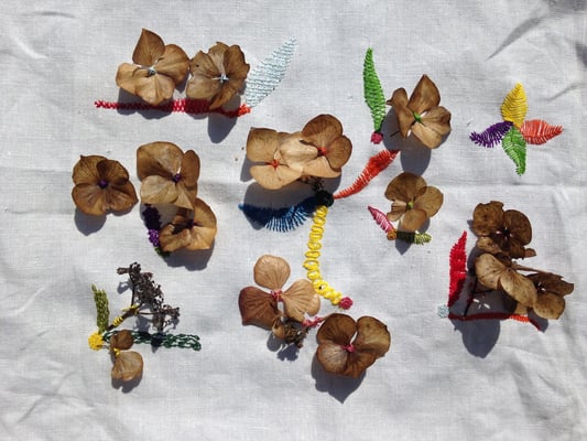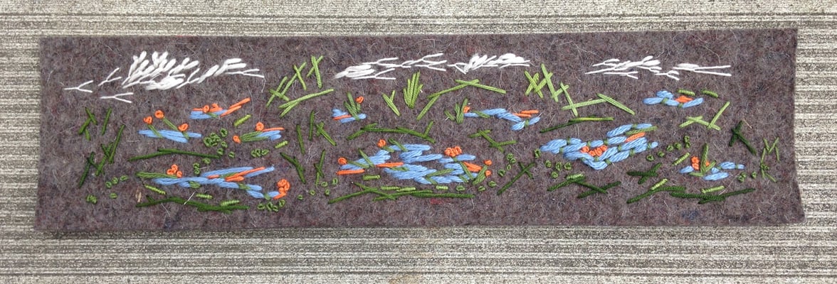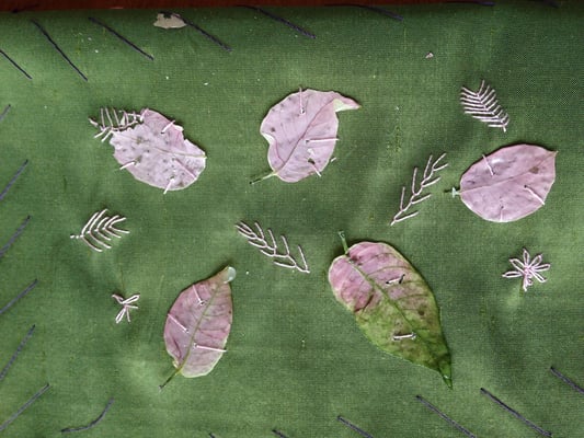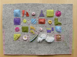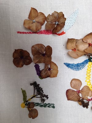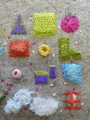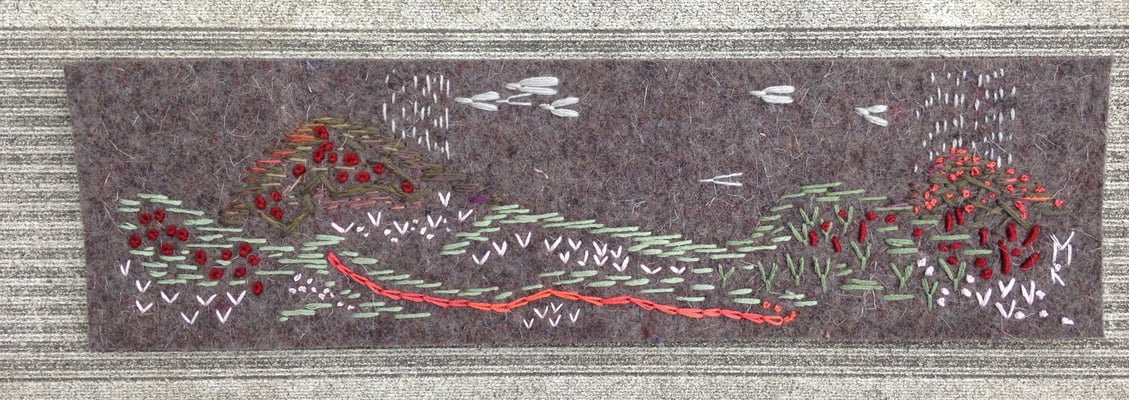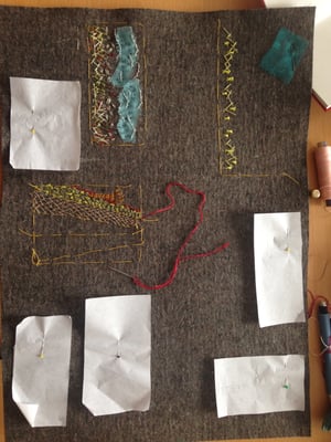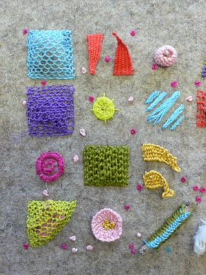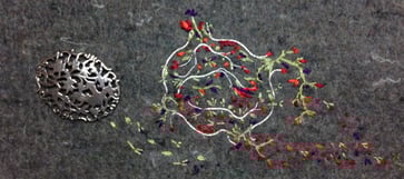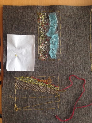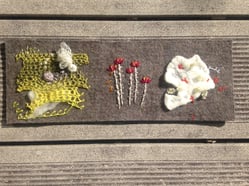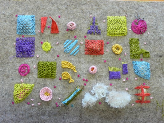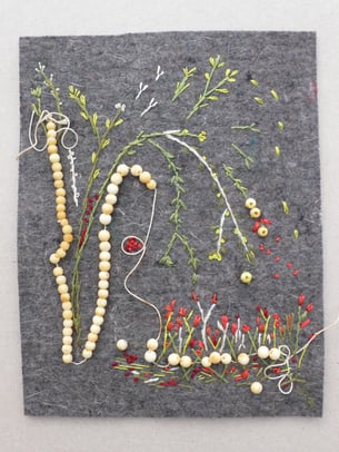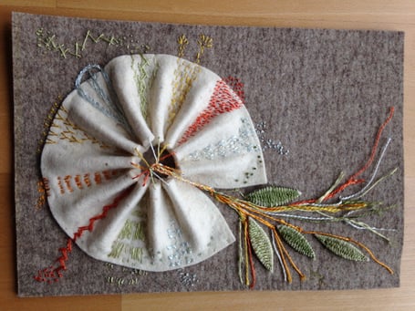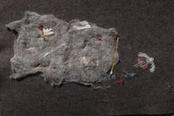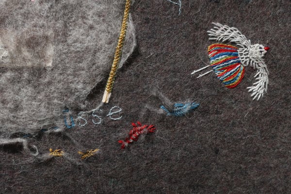 Industriefilz, alte und neue Seiden- und Wollfäden, gefundene Objekte aus der Natur und ein Billett