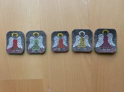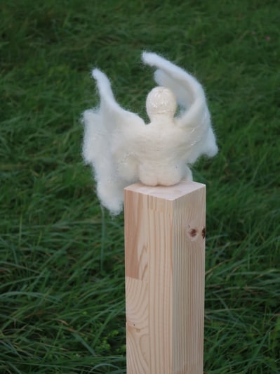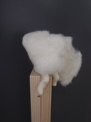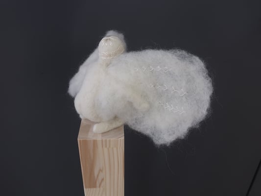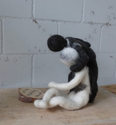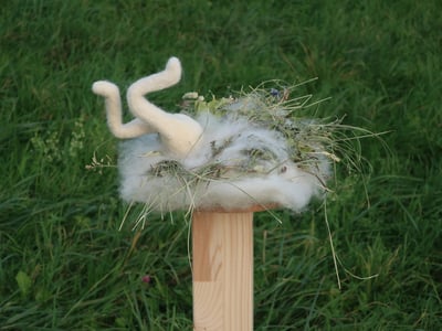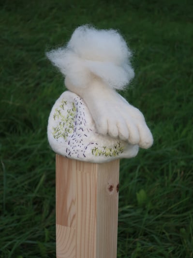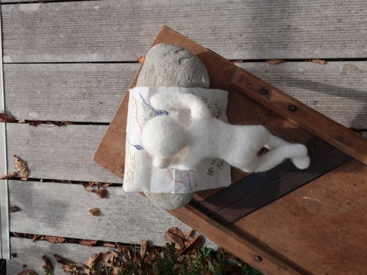 Figur aus der Wolle vom Walliser Schwarznasenschaf, besticktem Büttenpapier, Stein