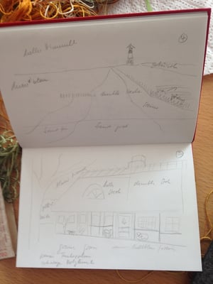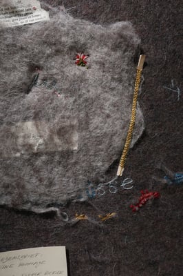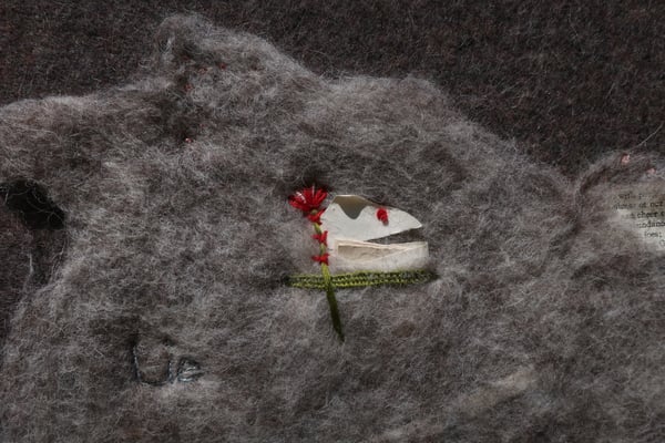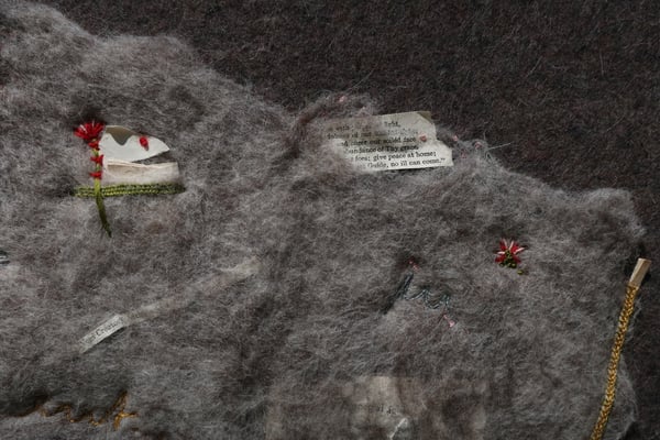 Handfilz aus Schweizer Wolle, Papier mit gedruckten Textpassagen und einem Gedicht, handbeschriebenes Papier, antike und neue Seidenfäden, Wolle auf