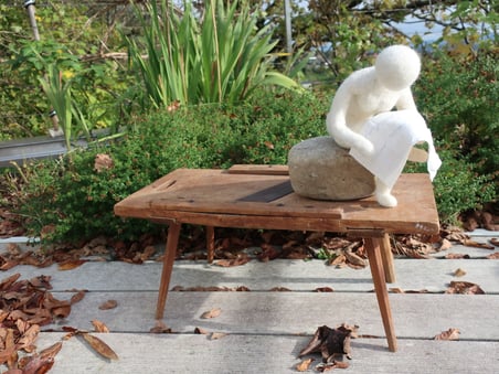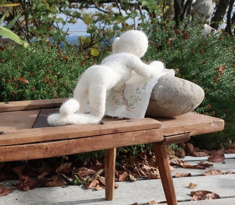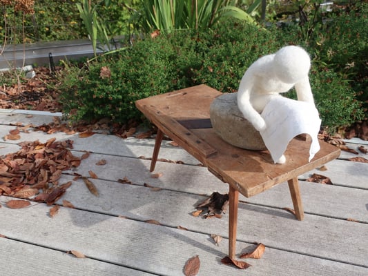 Sitzende Figur aus der Wolle vom Walliser Schwarznasenschaf, Gedichtfragment auf altem Leinen (Anfang von Sonnet 33), Stein